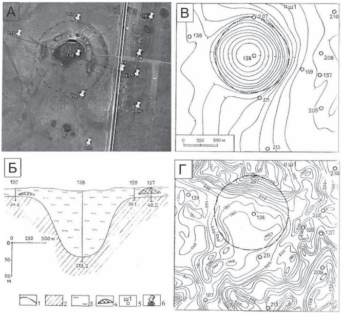 Кунгуртауская кольцевая структура: А – космический снимок; Б – схематический геологический разрез; В – изоаномалы силы тяжести; Г – изодинамы dZ (нТл); 1 – контур метеоритного кратера по геофизическим данным; 2 – породы скального фундамента; 3 – рыхлые покровные отложения;