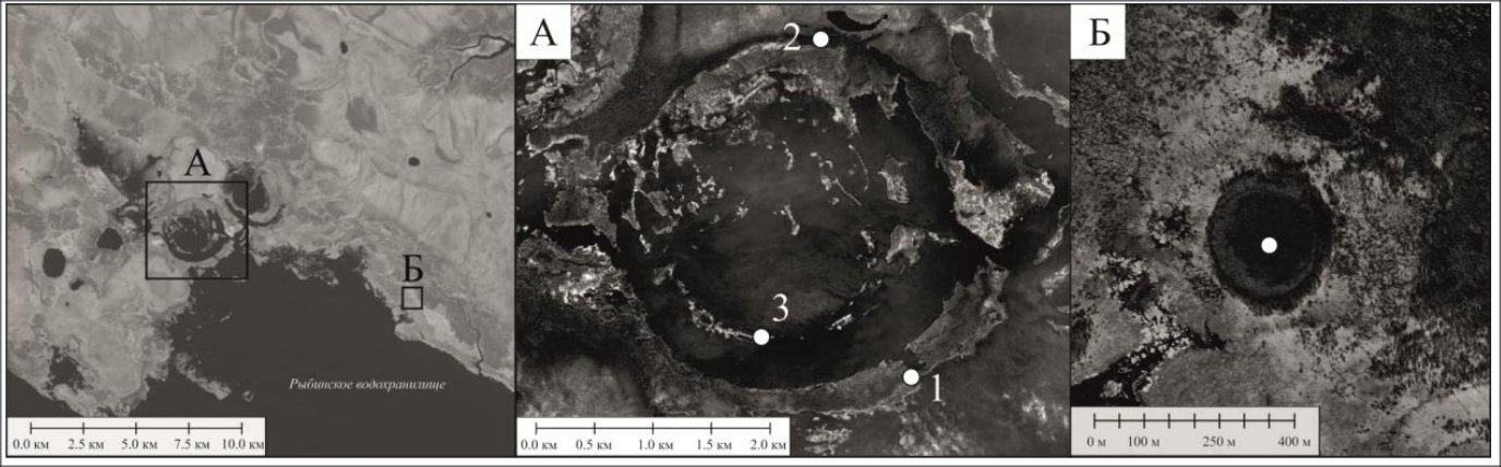 Слева: Местоположение района исследований на территории Дарвинского заповедника (снимок Landsat 5 от 22.08.2011). Квадратами А и Б отмечены соответственно кольцевые структуры Бор-Тимонино и Яна. По центру (А): Кольцевая структура Бор-Тимонино (снимок Bing). Пронумерованными белыми кружками отмечены скважины, вскрывающие погребенный органогенный горизонт. Справа (Б): Кольцевая структура Яна (снимок Bing). Белым кружком отмечено место бурения торфяных отложений