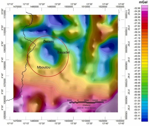 Bouguer gravity anomaly map of the study area (red circle).